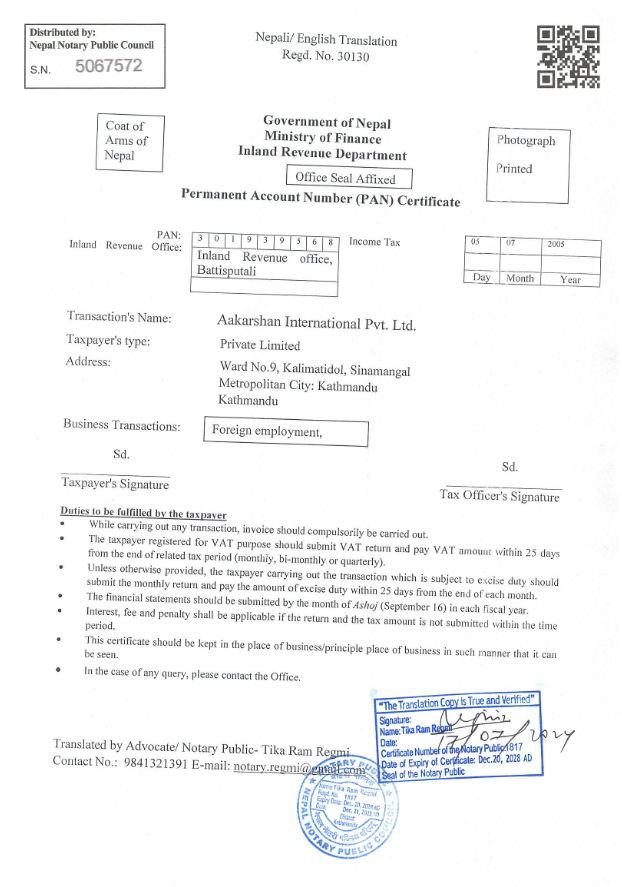 PAN Certificate